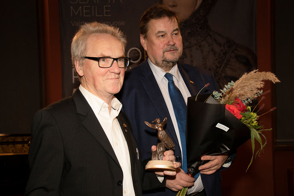 Dr. Stasiui Tumėnui Lituanistikos tradicijų ir paveldo įprasminimo komisijos vardu įteikta padėka už ilgametį mokslinį ir pedagoginį darbą, lituanistikos puoselėjimą, išeivijos lituanistinio paveldo saugojimą ir sklaidą. Kairėje – kalbos premijos laureatas VU dr. Regimantas Tamošaitis. Nuotr. LRS kanceliarijos.